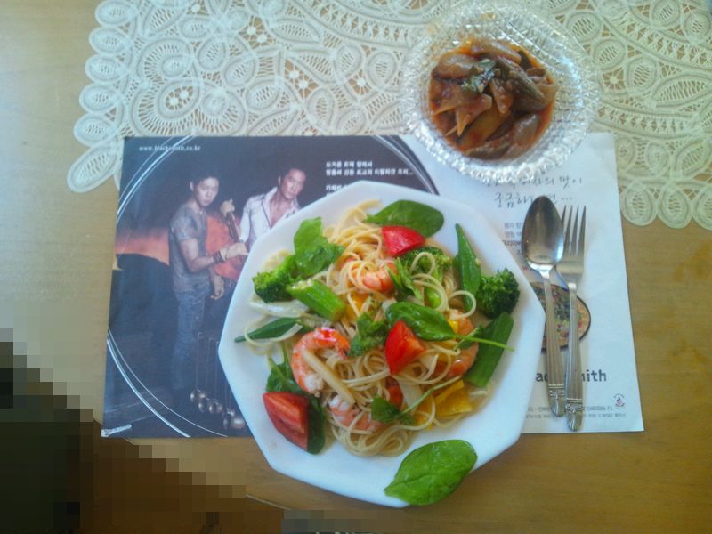 ↑の写真はもちろん、blacksmith・・・ではなく、ちんぐお手製の「エビと夏野菜の冷製パスタ」です。