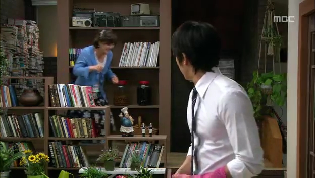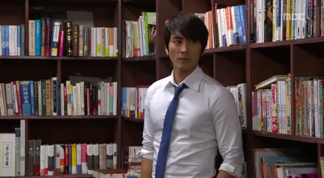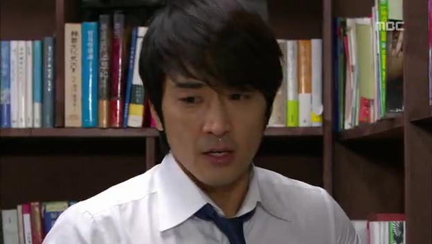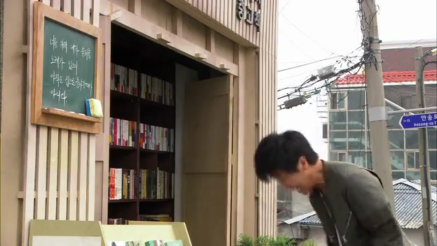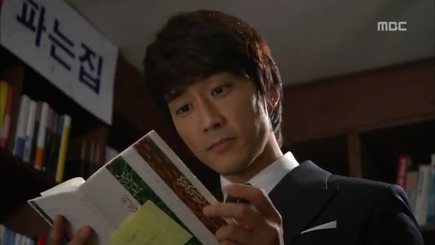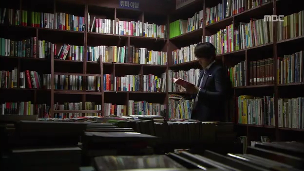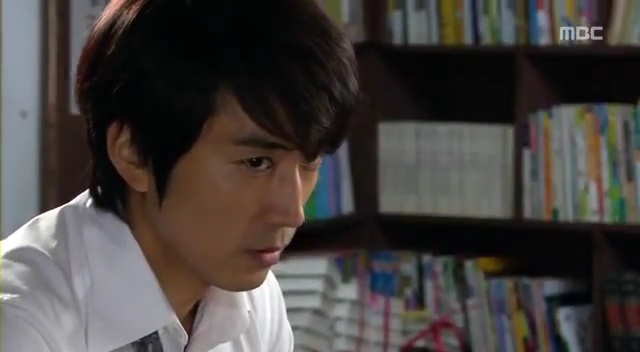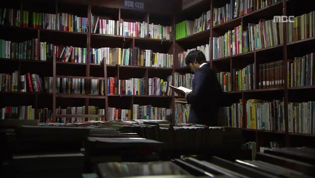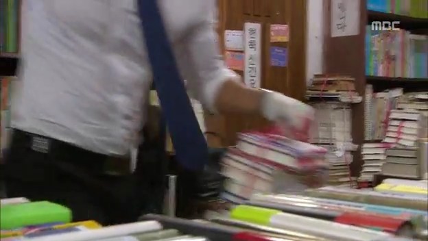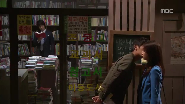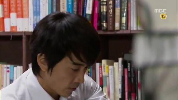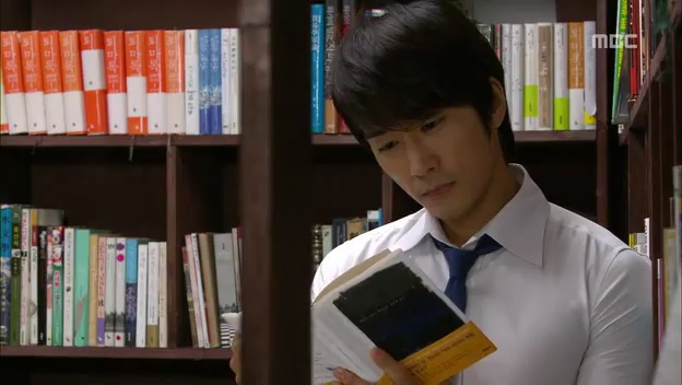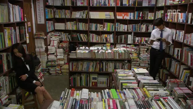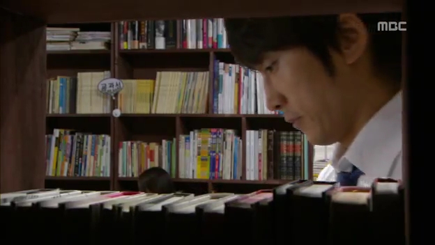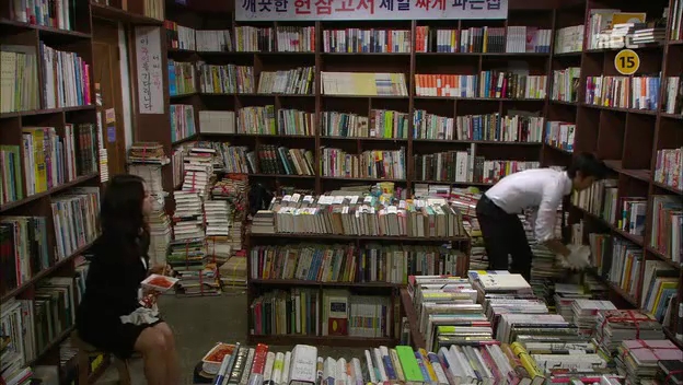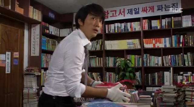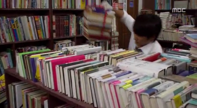ミドの父の書店で、なぜかかいがいしく書棚整理をするテサン。