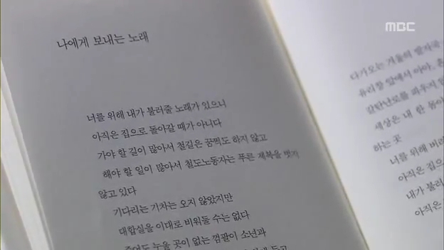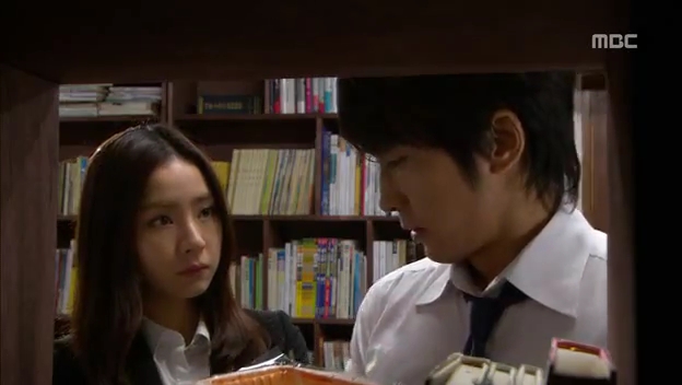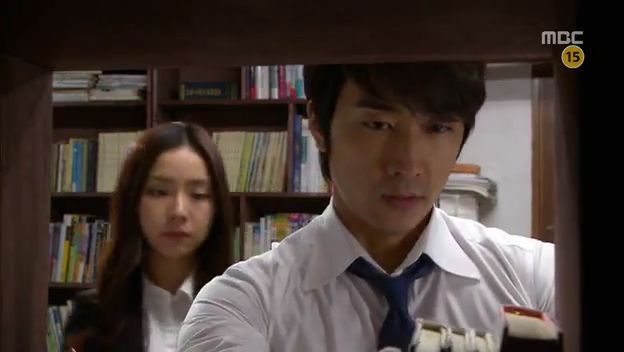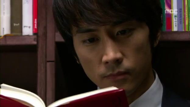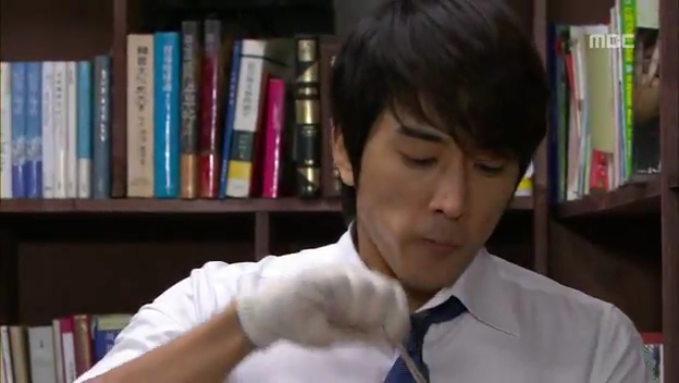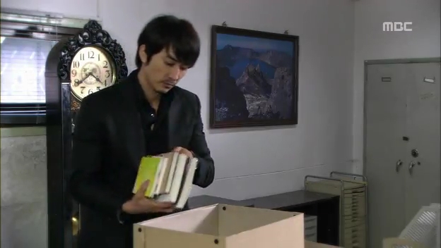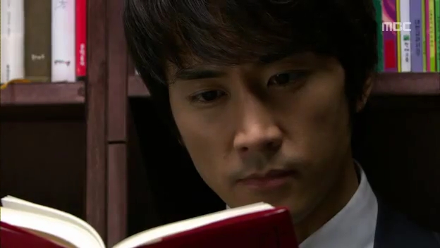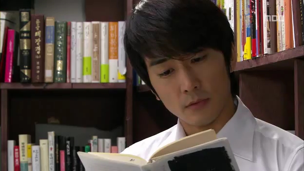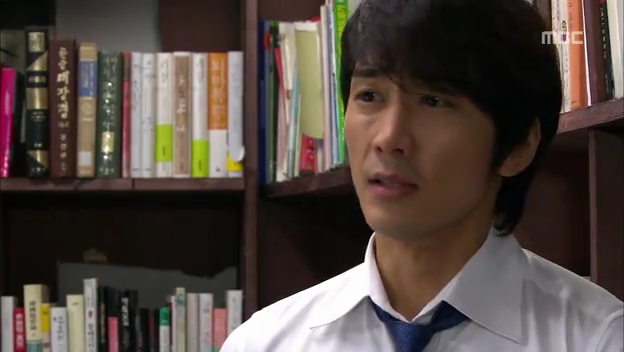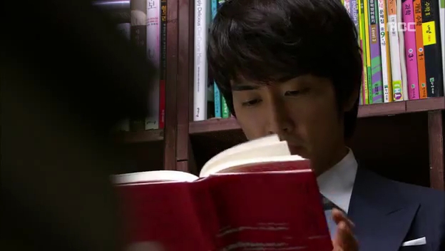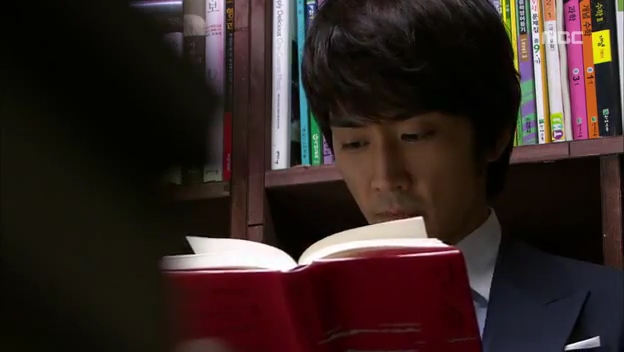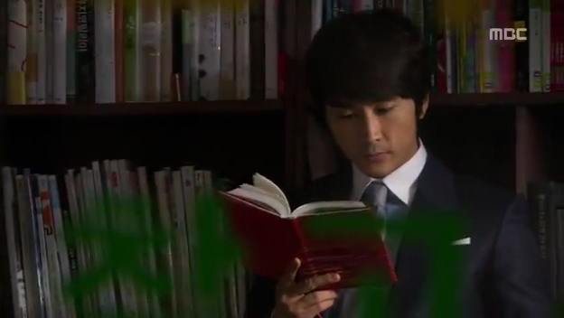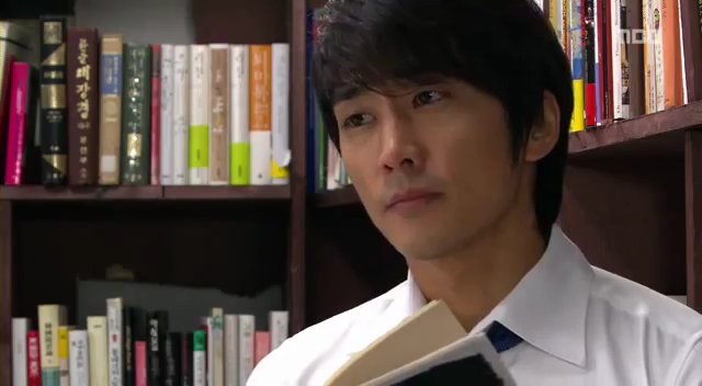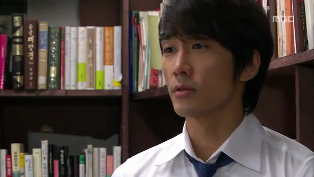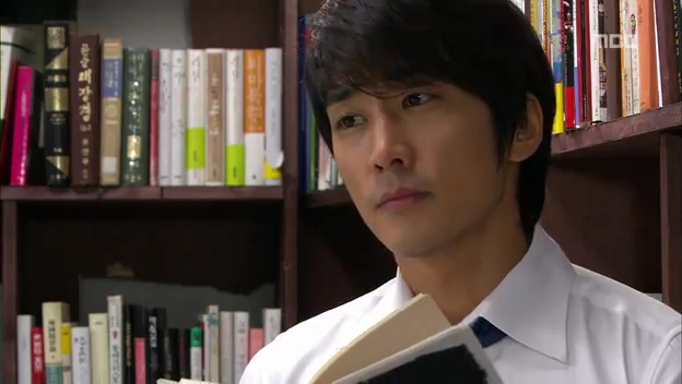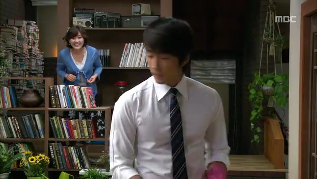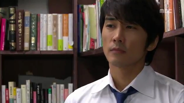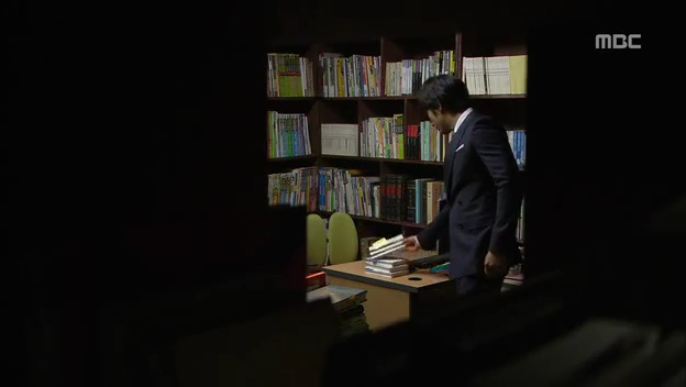 ミドの父の書店で、なぜかかいがいしく書棚整理をするテサン。